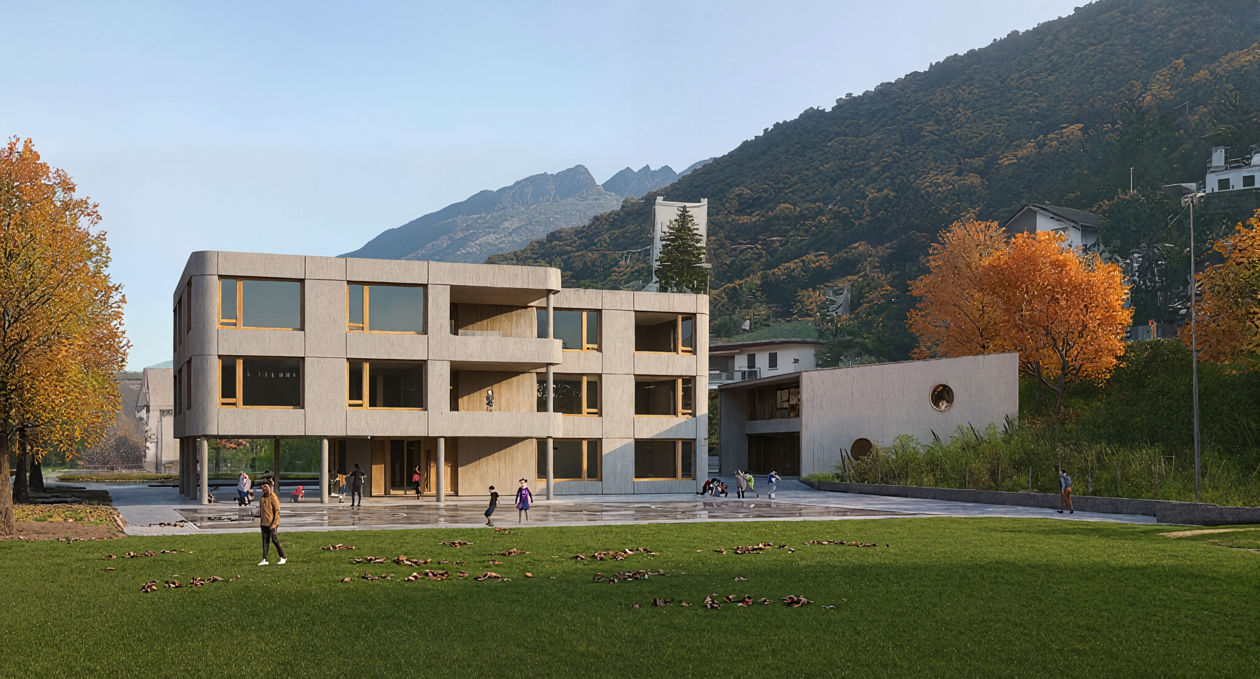 Das Projekt geht von einer sorgfältigen Analyse der inneren Qualitäten des Ortes aus; die geografische Lage ist günstig, die Ausrichtung des Grundstücks, die Verfügbarkeit von Aussenbereichen, der Kontakt mit natürlichen Elementen wie den Weinbergen und den Bergen, aber auch die Nähe zum historischen Zentrum. Das Projekt versucht, alle Qualitäten des Ortes zu vereinen und sieht in der Mitte des Pausenplatz einen Synthese- und Begegnungsraum vor.