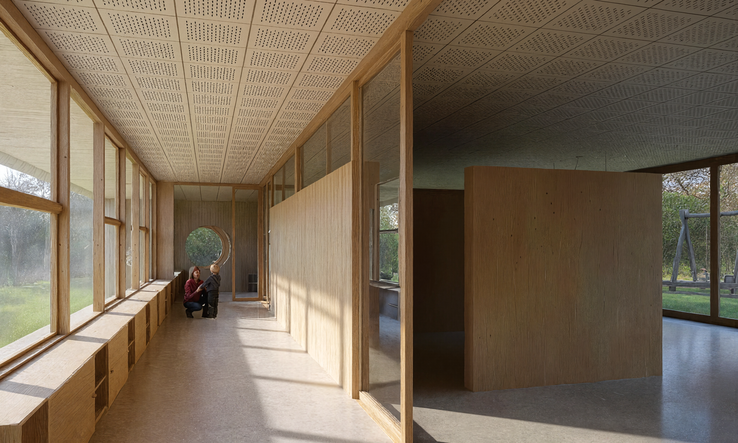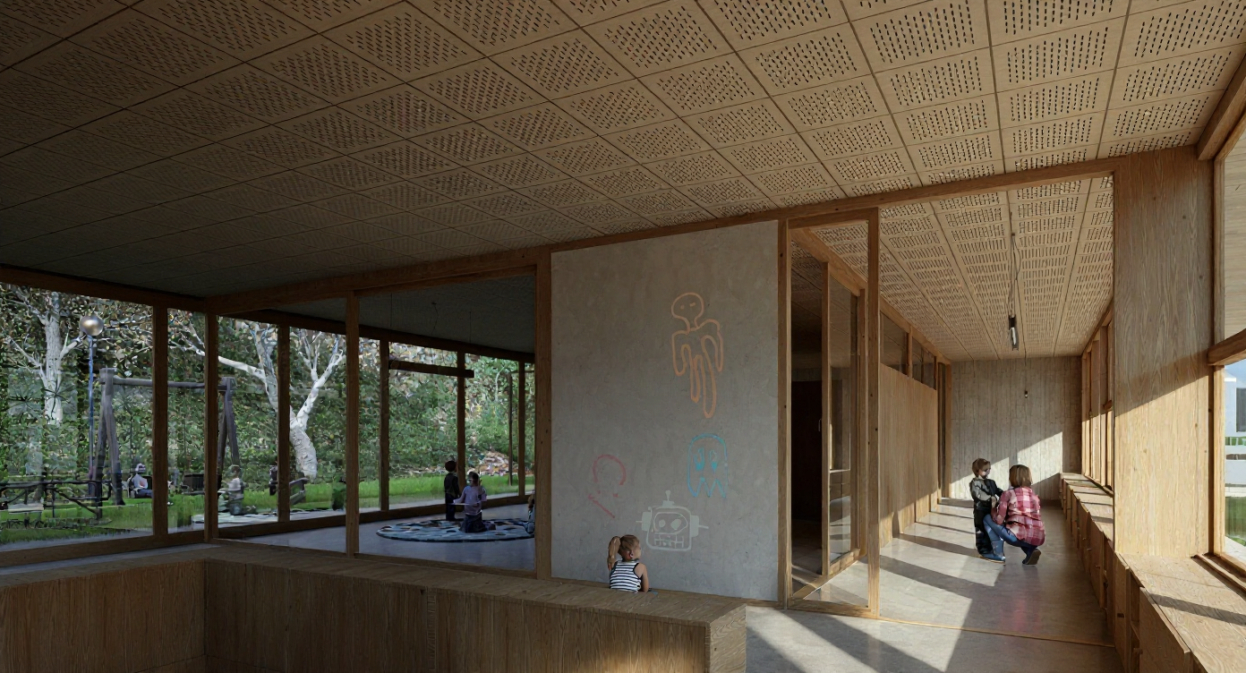 Besonderes Augenmerk wurde auf den Schutz der Nachbarschaft vor dem Schülerverkehr und umgekehrt gelegt. Dieselbe Achse verbindet auch direkt die zweite Phase des Projekts, die Kinderkrippe.