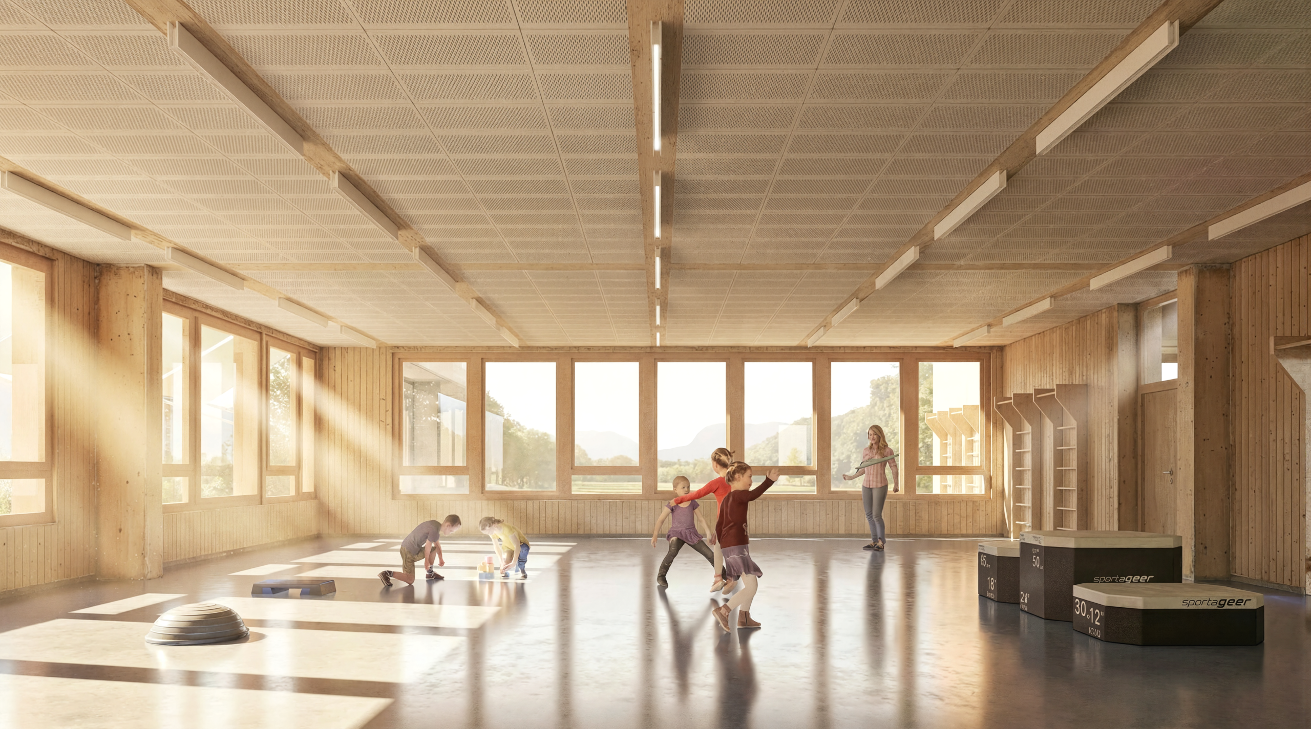 Cette implantation sur la partie Ouest du site permet de créer une « place de l’accueil » qui donne un accès sécurisé pour la crèche, l’UAPE ainsi que la salle de rythmique perchée sur le 3e niveau offrant des vues imprenables sur le Chablais.